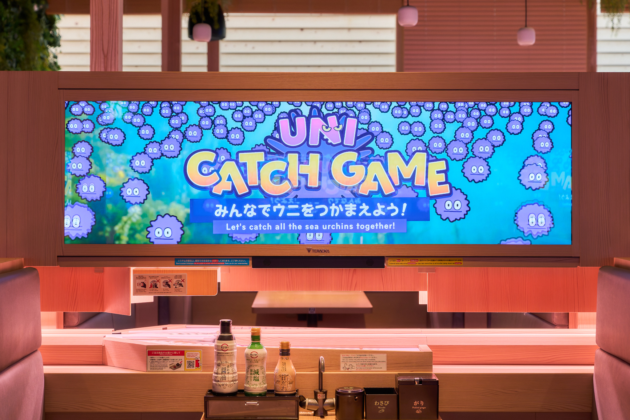 At the "Sushiro Future Expo Restaurant," which Sushiro opened at the 2025 World Expo (Osaka-Kansai Expo), we were responsible for key visual development, in-store video production, and interactive game content production. Under the catchphrase "Rotating sushi leads to sustainable sushi," we developed an opening movie and key visuals that convey Sushiro's various initiatives aimed at a sustainable future for "fish" and "sushi" in 2050, allowing visitors to enjoy and deepen their understanding of the SUSHIRO 2050 concept. Additionally, as game content that can be enjoyed while learning through the ordering tablet "Digiro," we created a role-playing game called "SUSHI QUEST," where players become heroes and solve challenges faced by the fishing industry in a quiz format, as well as the "UNI CATCH GAME," which teaches about marine environmental issues caused by the increase of sea urchins and how catching sea urchins helps seaweed grow and protects the ocean.